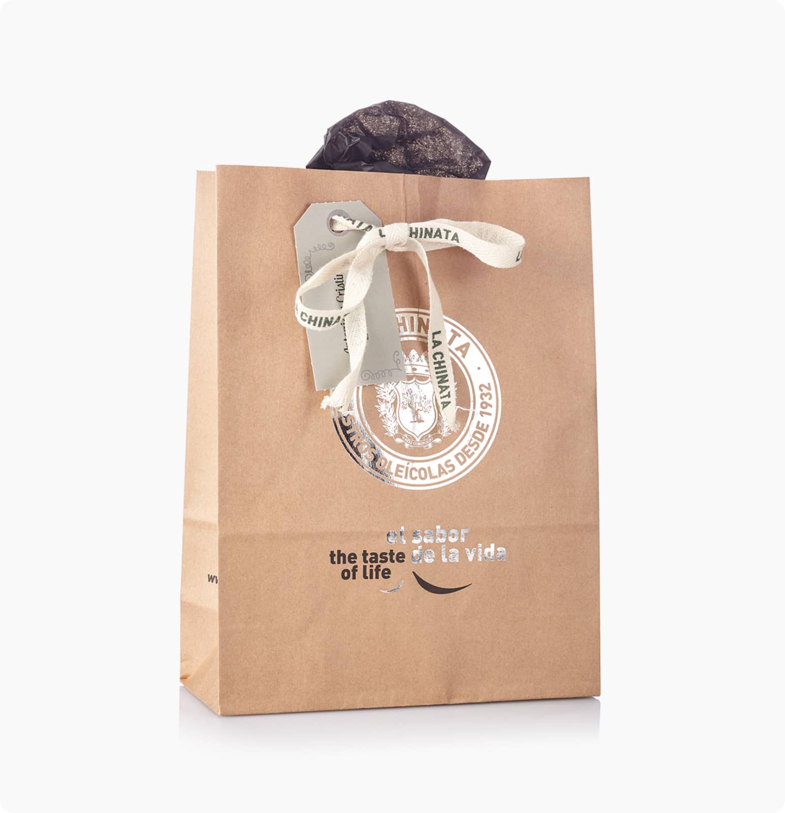 · Pedido mínimo: 20 bolsas. Cada una va acompañada por un sofisticado papel de seda en tono oscuro y un lazo para decorar el cierre de la bolsa.