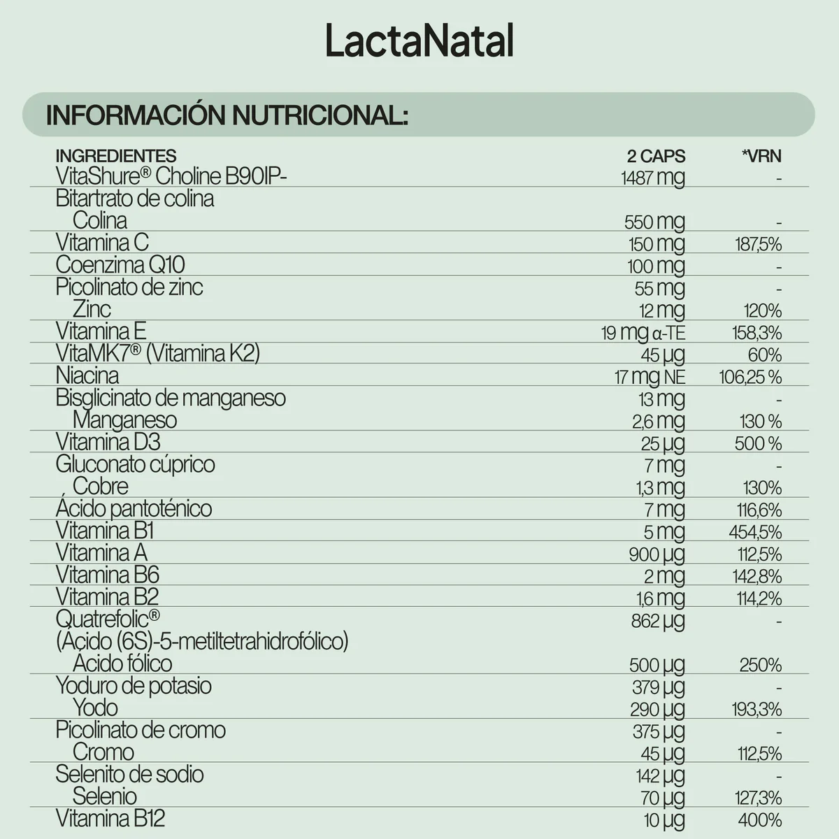 Multivitamínico y mineral específico para la etapa de lactancia, formulado para acompañar las adaptaciones fisiológicas del postparto y cubrir el aumento de requerimientos micronutricionales de la madre, al tiempo que contribuye a una adecuada calidad nutricional de la leche materna. Su composición está diseñada para apoyar tanto el desarrollo del lactante, que depende en gran medida de la leche materna para su aporte de nutrientes clave, como la recuperación materna, en un periodo caracterizado por una elevada demanda metabólica, hormonal y energética.
