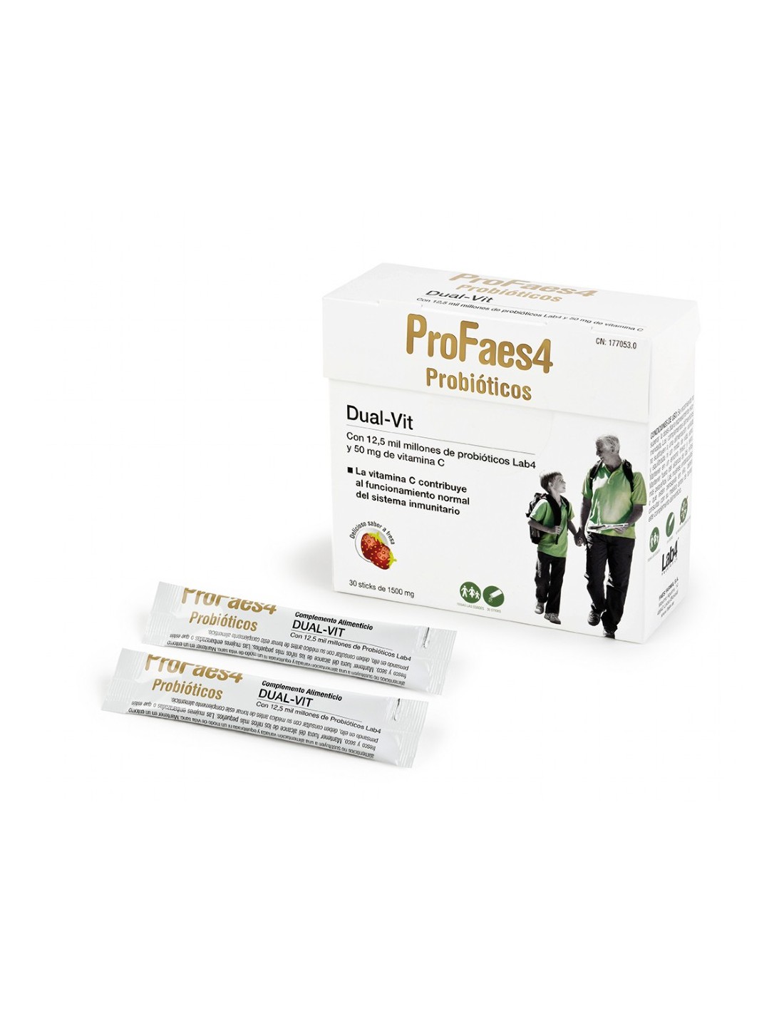 ProFaes4® Dual Vit es un simbiótico especialmente formulado con probióticos Lab4 y fructooligosacáridos, que además contiene vitaminas C y D3 que contribuyen al normal funcionamiento del sistema inmune.