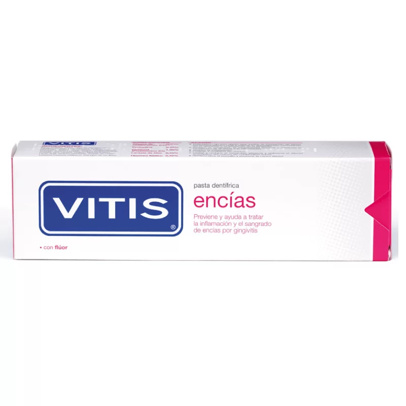 Vitis Pasta Dentífrica Encías 150ml es un dentífrico específicamente formulado para evitar y prevenir el sangrado y la inflamación gingival, al mismo tiempo que alivia sus signos asociados. Esta pasta dental, que se presenta en tubo de 150ml, reduce el hinchazón y mantiene la máxima limpieza de la cavidad bucal. Su fórmula contiene cloruro de cetilpiridino, que evita la aparición de gingivitis al impedir la formación de placa bacteriana y lactato de zinc, que fortalece el efecto antiséptico del cloruro y reduce el sangrado gingival. El pantenol, por su parte, evita la inflamación y protege con eficacia la sensibilidad de la encía. Su contenido en fluoruro Sódico remineraliza el esmalte y previene la aparición de caries, mientras que el permethol también disminuye el sangrado y la sensibilidad gingival y le devuelve a la encía toda su fortaleza.
